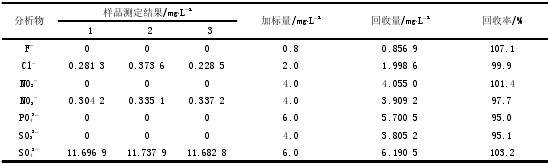 用離子色譜法可以同時測定脫硫副產物中常見7種陰離子,方法快速、準確可靠。根據SO42-的含量,通過計算可知副產物中含硫量為25.33%,與氯化鋇沉淀法分析結果23.62%相近。而氯化鋇沉淀法只能提供副產物中含硫量一種陰離子的分析結果,而且操作復雜,步驟繁瑣。離子色譜分析提供了一個更方便、更簡單、更準確的測量方法。由于副產物中某些陰離子含量低、化學穩定性差、樣品貯存時間較長,F-、PO43-、NO2-、SO32-等陰離子未檢出。
