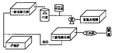鍋爐煙氣進入塔前電除塵器,除去煙氣中大部分煙塵后,進入特制的裝有雙流噴霧器的設備PT塔中,氨水由貯槽經泵加壓,與壓縮空氣混合后,進入塔中的雙流噴霧器。氨水以霧化狀與煙道氣在塔中順流接觸,并發生復雜的物理化學反應,煙道氣熱量使氨水中的水分全部汽化,氨水中的NH3與煙氣中的SO2、O2發生反應生成硫酸(suan)銨(an)。反應后(hou)的(de)煙氣再經(jing)塔后(hou)電除塵,由100m煙囪(cong)排出(chu),含有(you)(you)硫酸(suan)銨(an)和有(you)(you)機污染物的(de)煙塵回鍋爐焚燒。