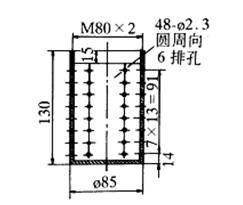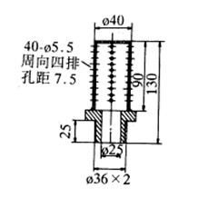 如圖3所示為國內某廠所生產的空氣分配閥用消聲器,所用閥的通徑為25mm,40個φ5.5的孔總面積相當于閥通流面積的1.936倍,所以,排氣是很流暢的。孔距b=7.5mm,孔距b和孔徑d=5.5之比為b/d=1.36mm,孔距實在太小,加之孔徑5.5 mm遠遠超過1~3mm,所以降噪性能很差,實測的降噪量僅為2.5dB。因此,應積極提倡不用該消聲器。