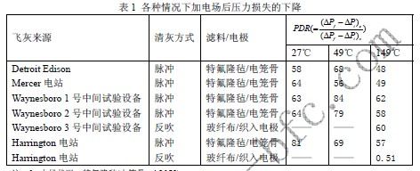 實際上,定性(xing)地(di)說,不同的(de)(de)電極結(jie)構和不同的(de)(de)濾料及粉(fen)塵相(xiang)結(jie)合,都可以取得(de)降低壓(ya)力損失的(de)(de)效果(guo)。表1 是(shi)Hovis 發表的(de)(de)另一項用來源不同的(de)(de)飛(fei)灰和不同的(de)(de)濾料與電極相(xiang)組(zu)合進(jin)行(xing)試驗取得(de)的(de)(de)結(jie)果(guo)。表中數據說明,在(zai)各種情況下(xia),加電場(chang)后壓(ya)力損失都是(shi)下(xia)降的(de)(de),在(zai)高(gao)溫下(xia)同樣(yang)能(neng)取得(de)這種效果(guo)。