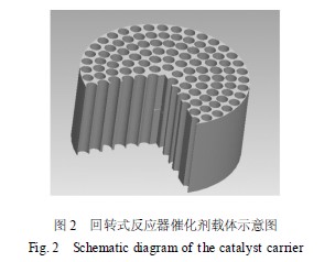 圖2 為新型回轉式脫硫脫硝反應器的催化劑載體示意圖,此載體選用陶瓷作為本體,起支撐作用. 陶瓷載體表面是Al2O3 ,作為鋁基銅催化吸附劑的載體,然后涂抹CuO 吸附劑. 本載體采用圓形管道設計,與以往的矩形管道相比,可以有效增大吸附表面積,且采用這種形式可以有效克服顆粒催化劑帶來的磨損[4 ,5 ] .