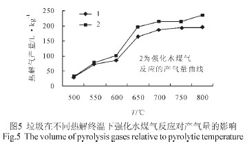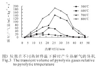 從圖(tu)2 中可(ke)以看到(dao),垃圾在(zai)高溫(wen)(wen)加(jia)(jia)熱(re)的情況(kuang)下,揮發(fa)出(chu)可(ke)燃氣(qi)(qi)(qi)體的體積隨著溫(wen)(wen)度的升(sheng)高而增加(jia)(jia)。從 600℃~750℃這個(ge)溫(wen)(wen)度區間內,揮發(fa)出(chu)的可(ke)燃氣(qi)(qi)(qi)體體積增加(jia)(jia)顯著,說(shuo)明這個(ge)溫(wen)(wen)度段是垃圾熱(re)解變化最為劇烈的階段。750℃之(zhi)后(hou),氣(qi)(qi)(qi)體產量沒有明顯的增加(jia)(jia)。