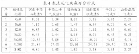 眾所周知,煤炭的灰分中大約95%以上是鈣、鎂、鈉、鐵、鋁、硅等元素的化合物。它們的存在形態在煤炭燃燒前后是不一樣,燃燒后生成物中的氧化鈣、氧化鎂、氧化鈉、氧化鉀是堿性金屬氧化物,它們具有中和酸的能力,三氧化二鐵和三氧化鋁是兩性氧化物,在酸性條件下也具有中和酸的能力。某些煤種燃燒后灰渣和飛灰成分分析見表4。