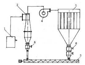 1.G4201雙嘴固定包裝機;2.CLK700擴散除塵器;3.GX300螺旋輸送機;4.4-72-11№.5C風機;5.ZD型袖袋除塵器(64袋);6.閃動閥