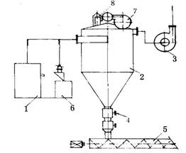 1.G4201雙嘴固定包裝機;2.FD180-78收塵器;3.4-72-11№.6C風機;4.雙層閃動閥;5.GX400螺旋輸送機;6.操作臺;7.反吹風機;8.行星擺線針輪減速機
