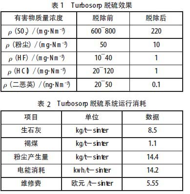該脫硫技術和除塵工藝具有以下技術特點:無污水外排;單塔處理能力大;無須防腐措施;脫硫裝置對負荷變化的適應性強。1999年,奧地利AEE公司為德國某廠設計建造了燒結廢氣回收處理凈化裝置,主要由噴淋吸收塔、活性褐煤噴射器和石灰乳噴射器以及布袋除塵過濾器組成,生石灰經加水形成石灰乳后通過高達13000r/min的旋轉噴射器在吸收塔下部逆向氣流噴射而出,石灰乳與煙氣中的硫化物混合發生化學反應,形成石膏,完成脫硫過程,脫硫后的煙氣通過管道進入布袋除塵器,管道上還安裝活性褐煤噴射器,將褐煤噴入管道與煙氣進行混合以脫除二惡英,煙氣進入布袋除塵器后,完成氣與塵的分離,塵循環使用一定次數后外排,用于填埋廢舊礦山。Turbosorp脫硫效果及運行消耗見表1,表2。
