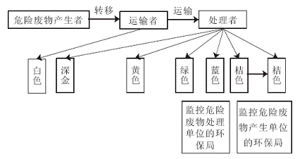 德國對危險廢物的監督管理主要采用危險廢物轉移聯單。一個危險廢物轉移聯單有5 聯復件, 每個危險廢物轉移聯單所到之處,都由當地的環保部門負責檢查。在危險廢物運輸過程中,必須事先出示危險廢物的轉移聯單。危險廢物轉移聯單的運轉方式見下圖。