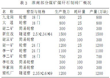 前面提到淮(huai)南礦區(qu)煤(mei)矸(gan)(gan)石(shi)屬于粘土巖類, 再(zai)加(jia)上(shang)含(han)有(you)大(da)約 3.0Mj/kg發(fa)熱量, 是代替(ti)粘土, 生產(chan)內燃磚(zhuan)(zhuan)的極好(hao)原料。淮(huai)南礦區(qu)煤(mei)矸(gan)(gan)石(shi)制(zhi)磚(zhuan)(zhuan)始(shi)于 60 年代, 70 年代有(you)了大(da)發(fa)展, 進入(ru) 80 年代后(hou), 制(zhi)磚(zhuan)(zhuan)工藝又有(you)了改進, 改輪窯(yao)等為隧窯(yao)。淮(huai)南各礦煤(mei)矸(gan)(gan)石(shi)制(zhi)磚(zhuan)(zhuan)廠(chang)情(qing)況匯于表 3