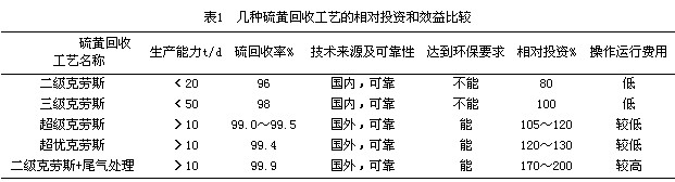 由于沒有復雜的加氫及醇胺吸收系統, 超優克勞斯工藝投資僅相當于同規模的克勞斯+尾氣處理工藝投資的70%~50%。如一個年產2萬t硫回收裝置,克勞斯尾氣處理工藝總投資一般要8000萬元人民幣以上,而超優克勞斯工藝總投資僅需5000萬人民幣左右。此外,克勞斯尾氣處理工藝需要消耗MDEA溶劑,同時溶劑需要不斷再生而消耗大量蒸汽。而超優克勞斯工藝簡單,僅需要少量加熱蒸汽,整體裝置還有富余蒸汽輸出,無需外供氫氣加氫,因此整體能耗不到克勞斯尾氣處理工藝的50%。超級優克勞斯和其他幾種硫黃回收工藝的相對投資和效益比較情況列于表1。