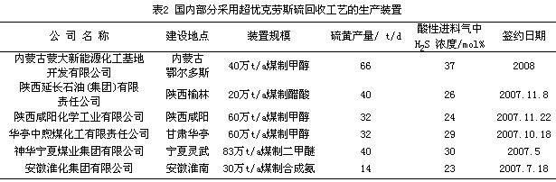 超優克勞斯工藝是荷蘭Jacobs公司的專利技術,具有超級克勞斯工藝的所有優點,不僅適用于現有的克勞斯裝置改造,也適用于新建裝置,在石化、石油、天然氣行業國內也有數套超優克勞斯裝置投入運行。從2007年起,國內新建的數套煤化工裝置都采用了超優克勞斯硫回收技術(見表2),目前大多在建。陜西榆林天然氣化工有限公司年產140萬噸煤制甲醇資源綜合利用項目中的五大關鍵生產技術之一硫回收技術采用超優克勞斯技術,計劃于2011年8月1日投料試車。此外,內蒙古天河化工有限責任公司年產100萬t煤制甲醇的一期工程年產60萬t甲醇項目也采用了超優克勞斯技術。