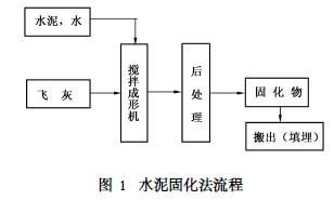 水泥是危險廢物最常用的固化劑,工程中常采用水泥對焚燒飛灰進行固化處理。將飛灰按一定比例摻入水泥基質后,加入適量水,在一定條件下,經過一系列物理、化學作用,使粒狀物料變成粘合的混凝土塊,從而使廢物因固化而穩定化。水泥固化法流程如圖1所示。