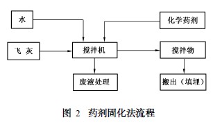 化學藥劑主要通過種機理起作用對飛灰值進行調整使重金屬離子達到最小溶解度的范圍根據所選化學藥劑成分的不同, 分別與重金屬產生不同類型的化學反應, 從而把重金屬由固相浸取到液相中降低飛灰中的重金屬含量或者通過與飛灰中重金屬生成不同的沉淀物而達到去除重金屬的目的通過對特定重金屬離子的吸附作用達到去除重金屬的效果。化學藥劑處理流程如圖所示。