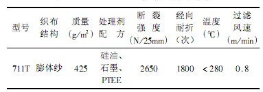 根據立窯煙氣性質,濾料選擇首先考慮的是要使濾料滿足高溫及耐腐蝕的要求,再考慮濾料的力學性能、耐磨折性和經濟性。因此立窯煙氣用的濾料應考慮選用玻纖濾料并且這種濾料是經過硅油、石墨、PTEE處理過的,這樣濾料耐磨性、耐折性成倍提高,并具有一定的增水性,且減少了結露時“糊袋”的可能性。另外,立窯煙氣的酸性腐蝕較嚴重,還要用耐酸配方處理濾料,可保持濾料在酸性環境中有較長的壽命。膨體紗結構的玻布濾料比連續纖維玻布濾料有更好的透氣性,運行阻力低,纖維覆蓋(孔隙)能力強,有利粉塵層的建立與維護,除塵效率高,所以濾料的織布結構應選用膨體紗。綜合以上條件,立窯袋式除塵濾料選擇Wid-wesco公司生產的711T玻纖濾料比較合適,正常使用壽命約為2~3年,711T濾料的性能指標見表1。若考慮經濟性也可選用國產的立窯專用玻纖濾料,但過濾性能有一定的差距,并且在除塵器的設計上處理同體積的煙氣,濾料的使用量要大的多。