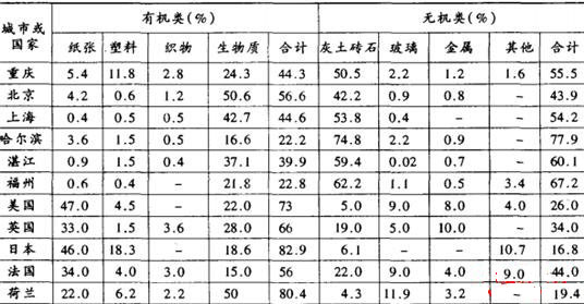 表1 國內外部分城市垃圾組成成分對照表![]() |