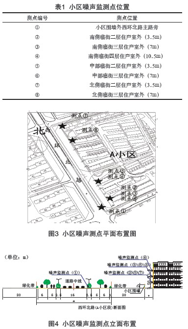 根據小區(qu)(qu)實際情況(kuang)選定有代表性的(de)位置作為(wei)(wei)噪(zao)聲(sheng)(sheng)監(jian)(jian)測(ce)(ce)(ce)點(dian)(dian),同時(shi)作為(wei)(wei)噪(zao)聲(sheng)(sheng)敏感點(dian)(dian),所得數據為(wei)(wei)治理(li)方案的(de)設計依據。噪(zao)聲(sheng)(sheng)監(jian)(jian)測(ce)(ce)(ce)共設置12個點(dian)(dian)(見表1),因小區(qu)(qu)中部為(wei)(wei)道(dao)路和(he)物業用(yong)房,故未在小區(qu)(qu)正中部選取監(jian)(jian)測(ce)(ce)(ce)點(dian)(dian)。同時(shi)對小區(qu)(qu)同時(shi)進行了噪(zao)聲(sheng)(sheng)敏感點(dian)(dian)垂(chui)直監(jian)(jian)測(ce)(ce)(ce)。小區(qu)(qu)的(de)噪(zao)聲(sheng)(sheng)監(jian)(jian)測(ce)(ce)(ce)點(dian)(dian)①~⑧的(de)位置見圖3、圖4。