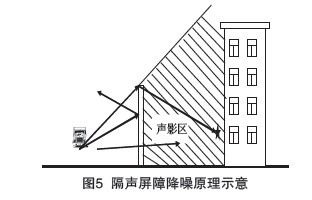隔聲(sheng)屏(ping)(ping)(ping)(ping)障(zhang)的降噪(zao)原理(li)主要(yao)是(shi)(shi)(shi)在(zai)(zai)道路聲(sheng)源(yuan)和受聲(sheng)點之間設置障(zhang)礙物,主要(yao)功能(neng)是(shi)(shi)(shi)阻擋聲(sheng)音的傳(chuan)播,將一(yi)部分聲(sheng)能(neng)反射回(hui)去(qu)(qu),僅使(shi)部分聲(sheng)能(neng)繞(rao)射過去(qu)(qu),在(zai)(zai)隔聲(sheng)屏(ping)(ping)(ping)(ping)障(zhang)背后形成一(yi)個聲(sheng)影區,從而使(shi)噪(zao)聲(sheng)降低。道路聲(sheng)源(yuan)輻射的噪(zao)聲(sheng)遇到隔聲(sheng)屏(ping)(ping)(ping)(ping)障(zhang)時將沿著三條(tiao)(tiao)途徑傳(chuan)播:首(shou)先聲(sheng)波是(shi)(shi)(shi)繞(rao)射至隔聲(sheng)屏(ping)(ping)(ping)(ping)障(zhang)聲(sheng)影區;第二條(tiao)(tiao)是(shi)(shi)(shi)聲(sheng)波直接透過隔聲(sheng)屏(ping)(ping)(ping)(ping)障(zhang)到達聲(sheng)影區;第三條(tiao)(tiao)是(shi)(shi)(shi)聲(sheng)波在(zai)(zai)隔聲(sheng)屏(ping)(ping)(ping)(ping)障(zhang)壁面(mian)上產生反射。隔聲(sheng)屏(ping)(ping)(ping)(ping)障(zhang)的降噪(zao)效果主要(yao)與屏(ping)(ping)(ping)(ping)障(zhang)的高度和長度及聲(sheng)源(yuan)與受聲(sheng)點的距離有關。其原理(li)見圖5。