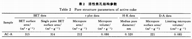 將原煤(工業分析和元素分析見表1)破碎至0mm~6mm左右,在中國科學院山西煤化所灰熔聚流化床粉煤氣化中試裝置上,以空氣/水蒸氣為活化劑,在850 C~950℃的溫度范圍內下,停留時間為10 min~30 min左右,同時炭化活化制得活性焦(稱為AC—A).活性焦的孔結構特性見表2.