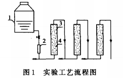 實驗工藝過程見圖1,裝置由一個原水儲槽、一個流量計和三個串聯的有機玻璃吸附柱組成,三個吸附柱后分別設有取樣口.吸附柱內徑2.6 cm,高 45.5 cm.實驗時下部進水,上部出水,靠壓差自流.