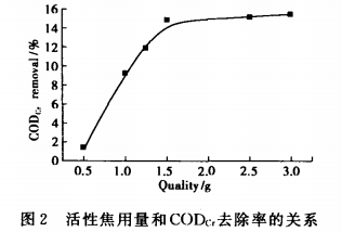 在室溫下,分別向5個250 mL的三角燒瓶中加入不同量的活性焦,然后向每個燒瓶中加入100 mL 原廢水,再將各三角燒瓶分別放在攪拌器上攪拌2 h,后將各三角燒瓶中廢水過濾,測定原廢水和各濾液的CODcr ,計算不同活性焦用量下COD 的去除率.