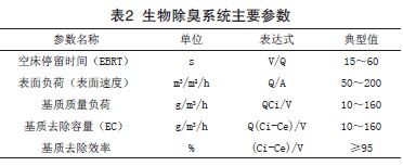 化學生物組合除臭系統中的化學系統根據預計處理親水物質量核算(與污泥處理工藝相關);生物系統主要應考慮的參數(以生物濾池為例)見表2。