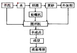 鋼渣小型空心砌塊是鋼渣、膠凝材料、輕集料、水以及化學外加劑等按一定比例經強制攪拌、澆注成型、脫模干燥、養護而成,其工藝流程圖見下圖。
