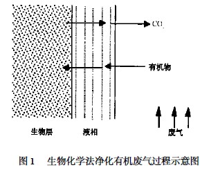 生物法的實質是利用有孔的、潮濕的介質上聚集的活性微生物的生命活動, 將廢氣中的有害物質轉變為簡單的無機物(如CO 2 和H2O ) 或組成自身細胞。 一般認為生物法凈化有機廢氣需經歷三個步驟: ① 有機廢氣成分首先同水接觸并溶于水中(即由氣相擴散進入液相) ; ② 溶解于液相中的有機成分在濃度差的推動下, 進一步擴散至介質周圍的生物膜(如圖1 所示) , 進而被其中的微生物捕捉并吸收; ③ 進入微生物體內的有機污染物在其自身的代謝過程中作為能源和營養物質被分解, 經生物化學反應最終轉化為無害的化合物(如CO 2 和H2O ) 。 這一過程見圖1。