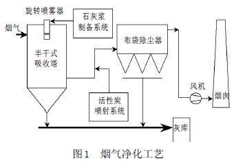 綜上(shang)所述,在(zai)技(ji)術選(xuan)擇(ze)和經濟選(xuan)擇(ze)的(de)基礎上(shang),利用比(bi)較分析法(fa)選(xuan)擇(ze)較合理(li)的(de)工藝。焚(fen)燒垃圾(ji)發電煙(yan)氣凈化技(ji)術方案推薦采用半干法(fa)脫酸塔加布(bu)袋除塵器(qi)的(de)組合工藝,如圖1 所示(shi)。