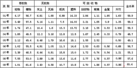 表2 2001年-2009年成都市中心城區生活垃圾物理成份、含水率分析