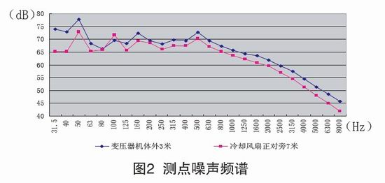 從對110kV、31,500kVA變壓器產生噪聲的1/3倍頻程的測試頻譜來看,變壓器噪聲呈明顯的中、低頻特性,在100Hz、200Hz、400Hz頻率上有突出的峰值。圖2是測點聲級為73.0dB的1/3倍頻程噪聲頻譜。