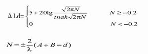 式中:N — 菲涅爾數;λ — 聲波波長(m);d — 聲源與受聲點之間的直線距離(m);A — 聲源至屏障頂端的距離(m);B — 受聲點至屏障頂端的距離(m)。