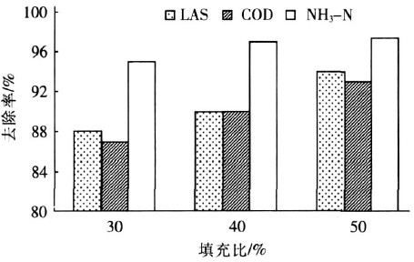 填料是微生物生長繁殖的場所,較大的填充比意味著較高的生物量,但是填充比過大會導致填料不能完全流化,將破壞反應器內的流態,導致處理效果下降。因此,應根據反應器的結構、曝氣方式、填料特性等選擇合適的填充比。