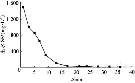 由圖3可以看到,由于下方曝氣的強度很大,對絲網表面的動態膜產生了強烈的沖刷作用,因此最初出水的SS相當高,可認為動態膜已被破壞。但隨著過濾時間的延長,出水中的SS不斷下降, 30 min 時即降到10 mg/L以下, 36 min后在出水中已檢測不到SS。與傳統活性污泥工藝相比,MBR內污泥的粒徑要小一些,絕大部分的粒徑<50μm[9]。研究中絲網的孔徑約為0. 05 mm,因此可以認為,對SS 具有截留作用的并不是絲網本身,而是能夠快速形成的動態膜。