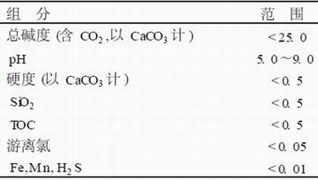 電除鹽(ED I) 技術是一種新的膜分離技術, 它巧妙地將電滲析技術和離子交換技術相融合, 無需酸堿,而能連續制取高品質純水。它具有技術先進、操作簡便及良好的環保特性。本項目選用GE公司的E - CELL模塊,每個模塊額定制水量2. 88 m3 /h,最大制水量3. 4 m3 /h, 膜堆型號 MK - 2,每套ED I裝置用8個膜塊。其出水水質如下:
