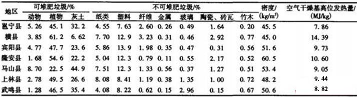 表1 2005年(nian)廣西部分縣生活垃圾物(wu)理組成和特性