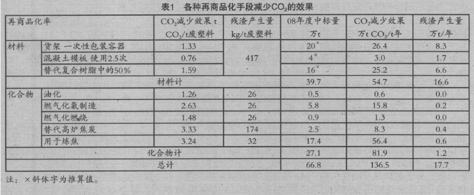 JFE 給予這個委員會全面協助,為塑料廢棄物高爐原料化及環境負荷評估提供基礎數據。表 1 列出了各種再商品化手段,這個報告記錄了CO2 的減少效果和殘渣產生量。高爐原料化手段的殘渣產生量,使用1t 容器包裝廢塑料產生174kg 殘渣,與其他化合物的循環方法相比并不多;同使用焦炭相比,每噸廢塑料能減少3.3t C02,體現出高爐利用廢塑料的顯著效果。