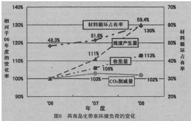 2008 年,容器包裝廢塑料的使用量為67 萬t,其中用于材料循環的40 萬t,用于化合物循環 27 萬t。根據這些數據,可以計算出CO2 的減少效果和殘渣的產生量。使用材料循環方法減少 CO255 萬t,殘渣產生量17 萬t;而進行化合物循環,可減少CO282 萬t,殘渣產生量1 萬t。因此進行化合物循環,CO2 減少效果極好,且殘渣產生量很少。圖 6 是過去三年再商品化帶來環境負荷的變化,將2006 年設為100,三年間廢棄物量增加了 13%,而CO2 減少量僅增加2%;2008 年較2007 年有所惡化,表現在殘渣產生量急劇增長了30%,說明在循環利用推進的同時也增加了環境負荷。