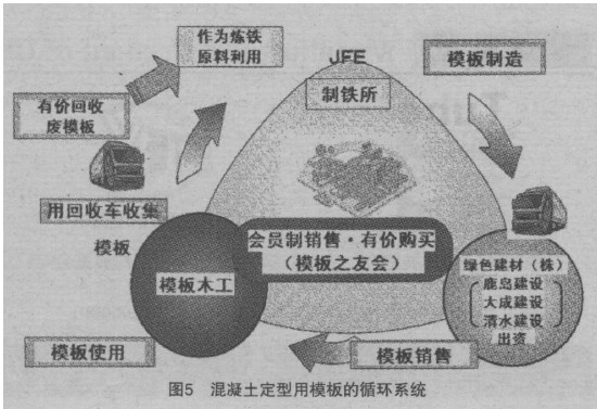 塑料容器包裝的廢塑料中含有適宜作為循環材料用的優質塑料。選出這些優質塑料,清除雜質后,生產的再生樹脂,可用于制造“混凝土定型用模板(NF 板)”。2002 年9 月,開始了這項工作,從2005 年開始,與高爐燃料化事業一樣,JFE 環境(株)開始了這項工作。另外,從 2004 年9 月開始,如圖5 所示,采取會員制銷售,有價購買廢模板,構建了混凝土模板的循環系統。這個循環系統從用廢塑料生產混凝土定型用模板,到建設現場的數次使用,廢模板回收,最后成為煉鐵原料等。而且,再資源化產生的殘渣,還可利用上述的APR 設備進行處理。
