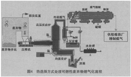 熱選擇方式的特征是,在約1200℃的高溫中將可燃性廢棄物燃氣化,并經過燃氣改質、精制過程,最大限度地限制二英類物質的產生。另外,產生的無機物渣體、金屬、金屬氫氧化物、硫磺等可以再資源化。