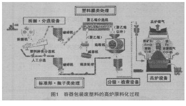 根據 2004 年4 月的《容器包裝循環法》,開始了塑料容器包裝的再商品化。為實現塑料容器包裝再資源化,用于高爐原料化處理過程如圖1 所示。高爐原料化設備的功能是:將自治體(日本專門從事循環經濟的單位)收集、并經壓縮打捆的標準物進行拆捆,用搖動式分選機分出固定形體、瓶子、薄膜,清除混入的異物;再通過人工對固定形體、瓶子的選取,將不適宜再資源化的東西清除后,用破碎機按照所需粒徑進行破碎,成為高爐用還原劑。另外,薄膜類經破碎機所定粒徑破碎后,由于薄膜密度差異,使用離心式密度分離裝置將聚氯乙烯分離出去后,通過造粒機將薄膜按所定粒徑造粒后作為高爐還原劑。為落實 2004 年4 月開始實施的包裝容器再商品化,東日本制鐵所京濱地區(川崎市)以及西日本制鐵所福山地區(廣島)的兩家鋼鐵廠,建設了高爐原料化設備。