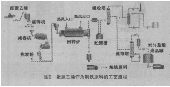 聚氯乙烯與氧氣在隔絕的狀態中,加熱到300~400℃,發生熱分解,生成HCl。利用這一性質,在圖2 所示的外熱式回轉爐內,將聚氯乙烯與媒介物進行攪拌進行熱分解,待熱分解產物冷卻后進行破碎,作為煉鐵原料。媒介體是鋼鐵廠使用的粉狀焦炭,防止分解物結塊以及防止附著在回轉爐內壁。由于回轉爐內的還原環境,不會產生二英類物質。熱分解煤氣從回轉爐排出后,隨著高溫燃燒,分解同時產生的碳氫化物,使碳氫化物不向環境排放。熱分解產生的HCl 在吸收塔被水吸收后,經過精餾,回收工業用鹽酸。回收的鹽酸在制鐵所內有效的進行用于鋼材生產的酸洗作業。塑料處理促進會和聚氯乙烯工業環境協會共同成功的進行了此項試驗,2004 年4 月正式開始實施,JFE 環境(株)于2005 年接手此事業。