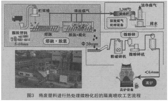 APR 設備由對容器包裝廢塑料的熔融、脫氯和微粉碎系統構成。首先將混合的廢塑料進行加熱熔融、脫氯、混合后,冷卻固化。在這個熱處理過程中脆化的廢塑料在常溫下粉碎,制成粒徑為200~400μm 的微粉塑料。這種微粉塑料與使用的廢塑料顆粒相比,提高了高爐內的反應效果,從而進一步提高高爐對廢塑料的利用效率。