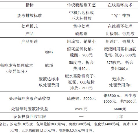 表1 蝕刻液在線循環技術與傳統硫(liu)酸銅(tong)工藝經濟指標對比 |