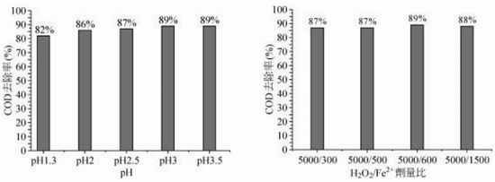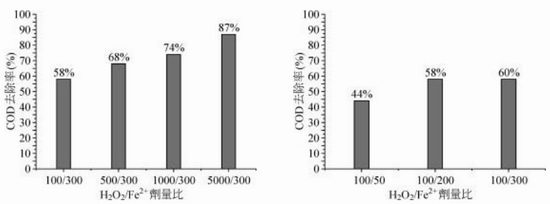 圖4 固定Fe2+劑量(300 mg/l)改變H2O2劑量對COD去除的影響 圖5 固定H2O2劑量(100 mg/l)改變Fe2+劑量對COD去除的影響 |