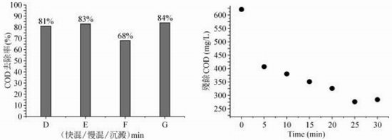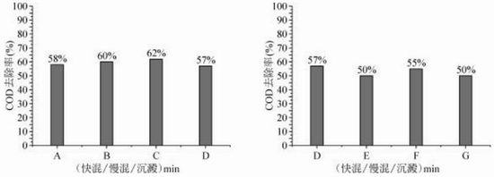 注:A為快混30 min沉淀30 min、B為快混60 min沉淀30 min、C為快混90 min沉淀30 min、D為快混2 min慢混28 min沉淀30 min。D為全部加入H2O2 / Fe2+藥劑量、E為H2O2全加,Fe2+每隔10 min三次加入、F為Fe2+全加,H2O2每隔10min分三次加入、G為H2O2 / Fe2+每隔10 min分三次同時加入。
