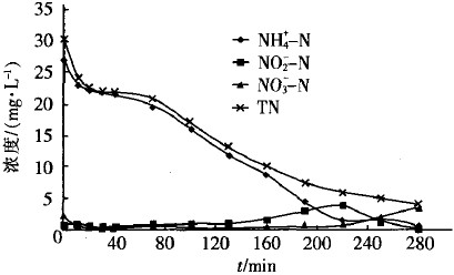 從試驗可知,在(zai)(zai)厭(yan)氧(yang)(yang)(yang)結束后的(de)(de)(de)(de)前3 h曝(pu)氣(qi)反(fan)(fan)(fan)應 內,反(fan)(fan)(fan)應體(ti)系的(de)(de)(de)(de)DO濃(nong)度(du)從厭(yan)氧(yang)(yang)(yang)時的(de)(de)(de)(de)0.15 mg/L迅(xun)(xun) 速(su)(su)(su)(su)升(sheng)(sheng)至(zhi)好氧(yang)(yang)(yang)初期的(de)(de)(de)(de)0.80 mg/L左右,隨后維(wei)持在(zai)(zai) 0.80~0.95 mg/L,此環境利(li)于(yu)(yu)短(duan)程同步(bu)硝(xiao)(xiao)化(hua)(hua)反(fan)(fan)(fan)硝(xiao)(xiao) 化(hua)(hua)的(de)(de)(de)(de)進(jin)(jin)行。出(chu)現(xian)(xian)此現(xian)(xian)象的(de)(de)(de)(de)原因主(zhu)要有兩(liang)方(fang)面:一是(shi) 在(zai)(zai)該(gai)時間(jian)段(duan)內,微(wei)生物處(chu)于(yu)(yu)對數增殖期,耗(hao)(hao)氧(yang)(yang)(yang)速(su)(su)(su)(su)率(lv)(lv)(lv)(lv)處(chu) 于(yu)(yu)最(zui)大(da)時期;二(er)是(shi)硝(xiao)(xiao)化(hua)(hua)菌將氨氮氧(yang)(yang)(yang)化(hua)(hua)成亞硝(xiao)(xiao)酸鹽氮 的(de)(de)(de)(de)過程需要消耗(hao)(hao)大(da)量(liang)的(de)(de)(de)(de)氧(yang)(yang)(yang)氣(qi)。在(zai)(zai)這兩(liang)方(fang)面的(de)(de)(de)(de)共(gong)同作 用下,供氧(yang)(yang)(yang)速(su)(su)(su)(su)率(lv)(lv)(lv)(lv)與耗(hao)(hao)氧(yang)(yang)(yang)速(su)(su)(su)(su)率(lv)(lv)(lv)(lv)達到動態(tai)平衡,并維(wei)持在(zai)(zai) 較(jiao)低的(de)(de)(de)(de)DO濃(nong)度(du)范圍內。隨著曝(pu)氣(qi)進(jin)(jin)人(ren)最(zui)后1 h,反(fan)(fan)(fan) 應體(ti)系里的(de)(de)(de)(de)微(wei)生物處(chu)于(yu)(yu)減速(su)(su)(su)(su)增殖期,甚至(zhi)是(shi)內源(yuan)呼 吸期,需氧(yang)(yang)(yang)量(liang)迅(xun)(xun)速(su)(su)(su)(su)降(jiang)低;同時由于(yu)(yu)反(fan)(fan)(fan)應器內的(de)(de)(de)(de)氨氮已(yi) 近乎耗(hao)(hao)盡,硝(xiao)(xiao)化(hua)(hua)反(fan)(fan)(fan)應速(su)(su)(su)(su)率(lv)(lv)(lv)(lv)與耗(hao)(hao)氧(yang)(yang)(yang)速(su)(su)(su)(su)率(lv)(lv)(lv)(lv)也隨之迅(xun)(xun)速(su)(su)(su)(su)降(jiang) 低,導致體(ti)系的(de)(de)(de)(de)DO濃(nong)度(du)迅(xun)(xun)速(su)(su)(su)(su)升(sheng)(sheng)高。但在(zai)(zai)整個反(fan)(fan)(fan)應 過程中,幾(ji)乎沒有出(chu)現(xian)(xian)硝(xiao)(xiao)酸鹽氮的(de)(de)(de)(de)積(ji)累(lei),而且(qie)在(zai)(zai)DO 濃(nong)度(du)迅(xun)(xun)速(su)(su)(su)(su)升(sheng)(sheng)高前,體(ti)系中TP濃(nong)度(du)已(yi)達到較(jiao)高的(de)(de)(de)(de)出(chu) 水標準。這說明(ming)在(zai)(zai)反(fan)(fan)(fan)應體(ti)系內實現(xian)(xian)了短(duan)程同步(bu)硝(xiao)(xiao)化(hua)(hua) 反(fan)(fan)(fan)硝(xiao)(xiao)化(hua)(hua)耦合(he)除磷。