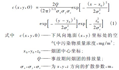 對有(you)毒有(you)害物質(zhi)在大氣中的擴(kuo)散(san),采用環(huan)境風(feng)險(xian)評(ping)價技術導則(ze)推薦的多煙團模式進(jin)行計算,見式(1) :