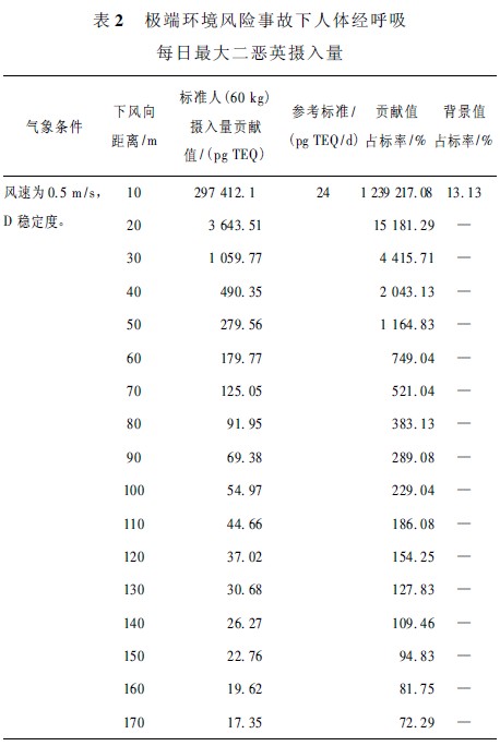 由表1 的計算結果可知:在正(zheng)常(chang)工(gong)況(kuang)(kuang)和不同的非正(zheng)常(chang)工(gong)況(kuang)(kuang)下人體經呼吸每日最大攝入二惡英的量(liang)均(jun)遠(yuan)小(xiao)于允許攝入量(liang)參(can)考標準值。