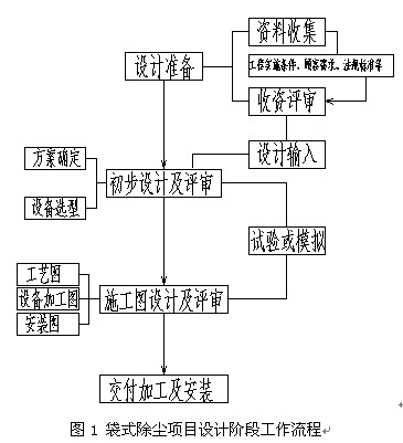 一個燃煤電廠鍋爐煙氣袋式除塵項目,完整的設計工作流程應該如圖1。需要特別指出的是,該流程圖中的“試驗或模擬”是不可缺少的一個環節,特別是關系到除塵器性能的氣流組織和清灰系統時,做試驗或計算機模擬是必要的步驟。試驗的方法是利用相似理論,按一定比例(保證幾何相似、運動相似和動力相似)建立物理模型,進行氣流組織和氣流分布裝置的試驗;而計算機數值模擬是以計算流體力學為基礎,以商用流體軟件為平臺,根據實際工程建立模型,進行數值計算,并以圖形化界面的直觀方式表達。