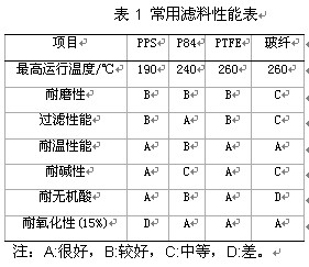根據上述要求,結合燃煤電廠煙氣特性,可以按下表粗略選擇濾料材質: