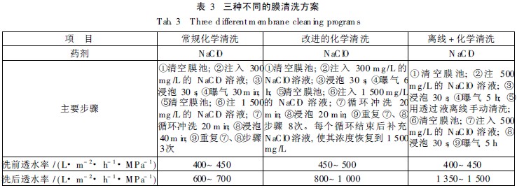 北小河污水(shui)(shui)處(chu)理(li)廠的MBR 工藝(yi)自投入使(shi)用(yong)至(zhi) 2009年10月均采用(yong)常(chang)(chang)規的化學清(qing)洗方(fang)案(an), 具體見表3。通過化學清(qing)洗可將(jiang)膜絲(si)表面(mian)的濾(lv)餅(bing)層及凝膠層去除, 恢(hui)復(fu)(fu)膜的透水(shui)(shui)性能(neng); 但隨著運行(xing)時間的增長, 膜元件局部出現較厚的濾(lv)餅(bing)層, 常(chang)(chang)規的化學清(qing)洗并(bing)不能(neng)獲得(de)理(li)想的效果, 透水(shui)(shui)率只能(neng)恢(hui)復(fu)(fu)到600~ 700 L / (m2·h·MPa), 而(er)正常(chang)(chang)情況下透水(shui)(shui)率應恢(hui)復(fu)(fu)到1 000 L / (m2·h·MPa)左右。